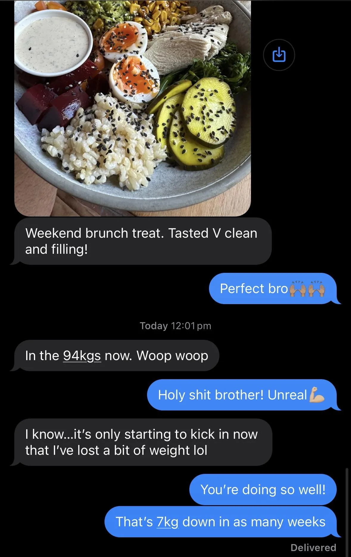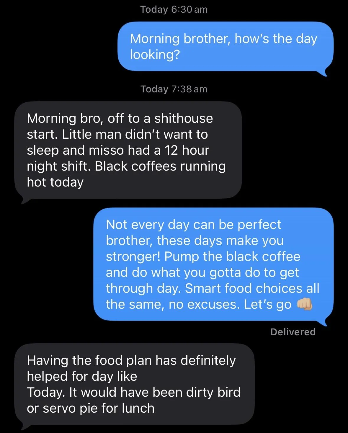 Your coach is on call whenever you need, motivating, inspiring, pushing you, and holding accountable to yourself and the people in your life that depend on you. This is not a set and forget program, you have weekly face to face check-ins online, reviewing the week that was and making data backed decisions to optimise the results of the week ahead.