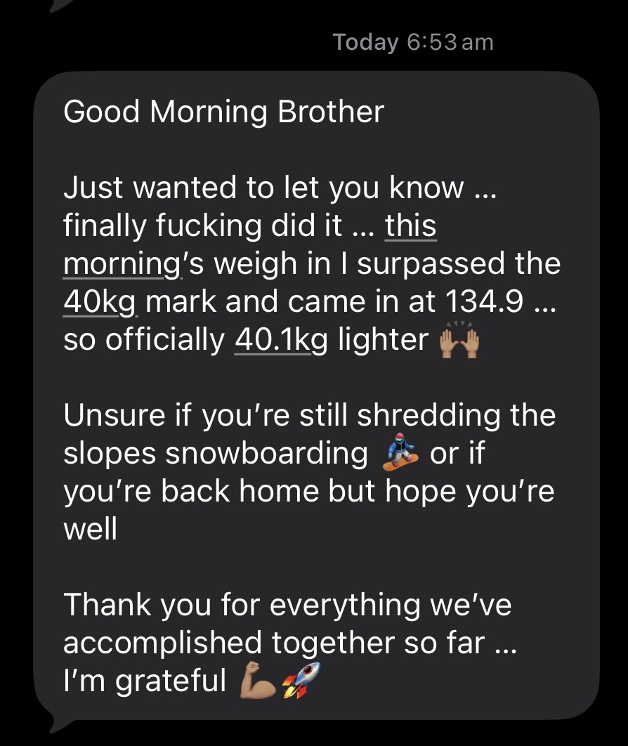 We specialise in working with busy men on tight schedules, running a business, building a career and providing for your family aren't excuses to deprioritise your health but they do require a strategic approach for results. We only work with guys that want to become the very best version of themselves, mentally and physically. We're not here to convince blokes that being overweight or burnt out is a bad thing, that should be common sense.